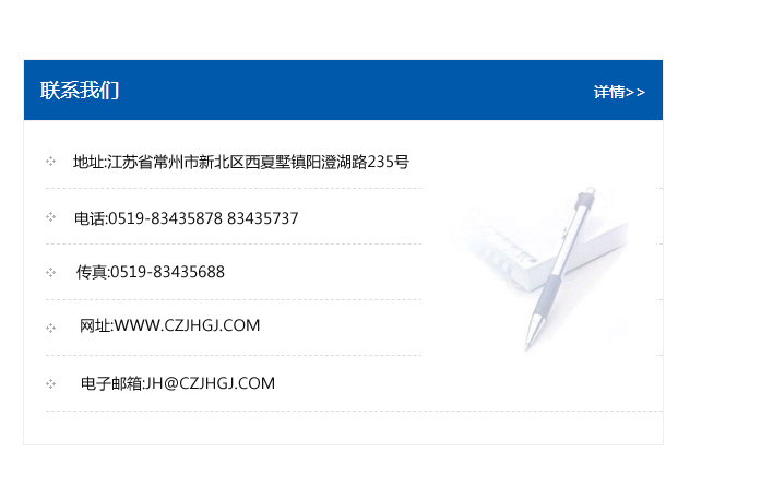 傳真:0519-83435688    郵編:213135    網(wǎng)址:WWW.czjhgj_com.kscxbz.com    電子郵箱:JH@czjhgj_com.kscxbz.com